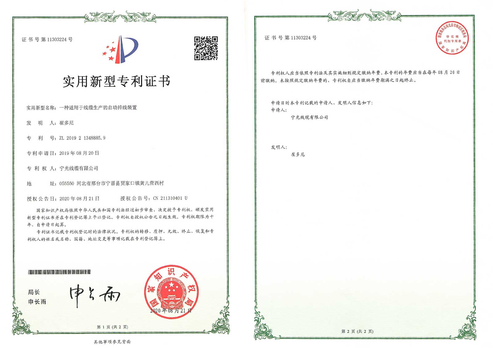 一種適用于線纜生產(chǎn)的自動(dòng)排線裝置實(shí)用新型專(zhuān)利證書(shū) -