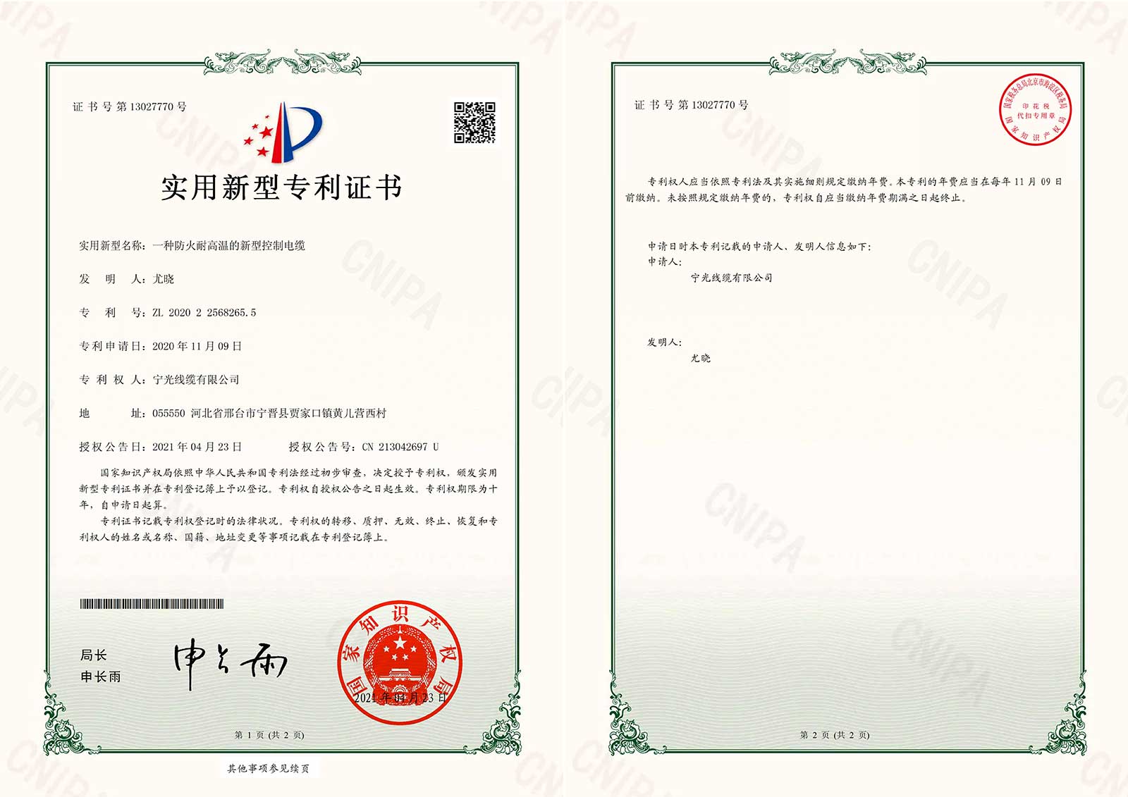 一種防火耐高溫的新型控制電纜實(shí)用新型專(zhuān)利證書(shū) -